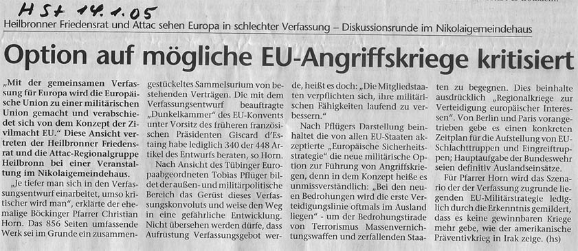 10. 1. 2005 Diskussion "Europa in schlechter Verfassung" mit Christian Horn und Tobias Pflüger (Abgeordneter EU-Parlament); Bericht der HSt
